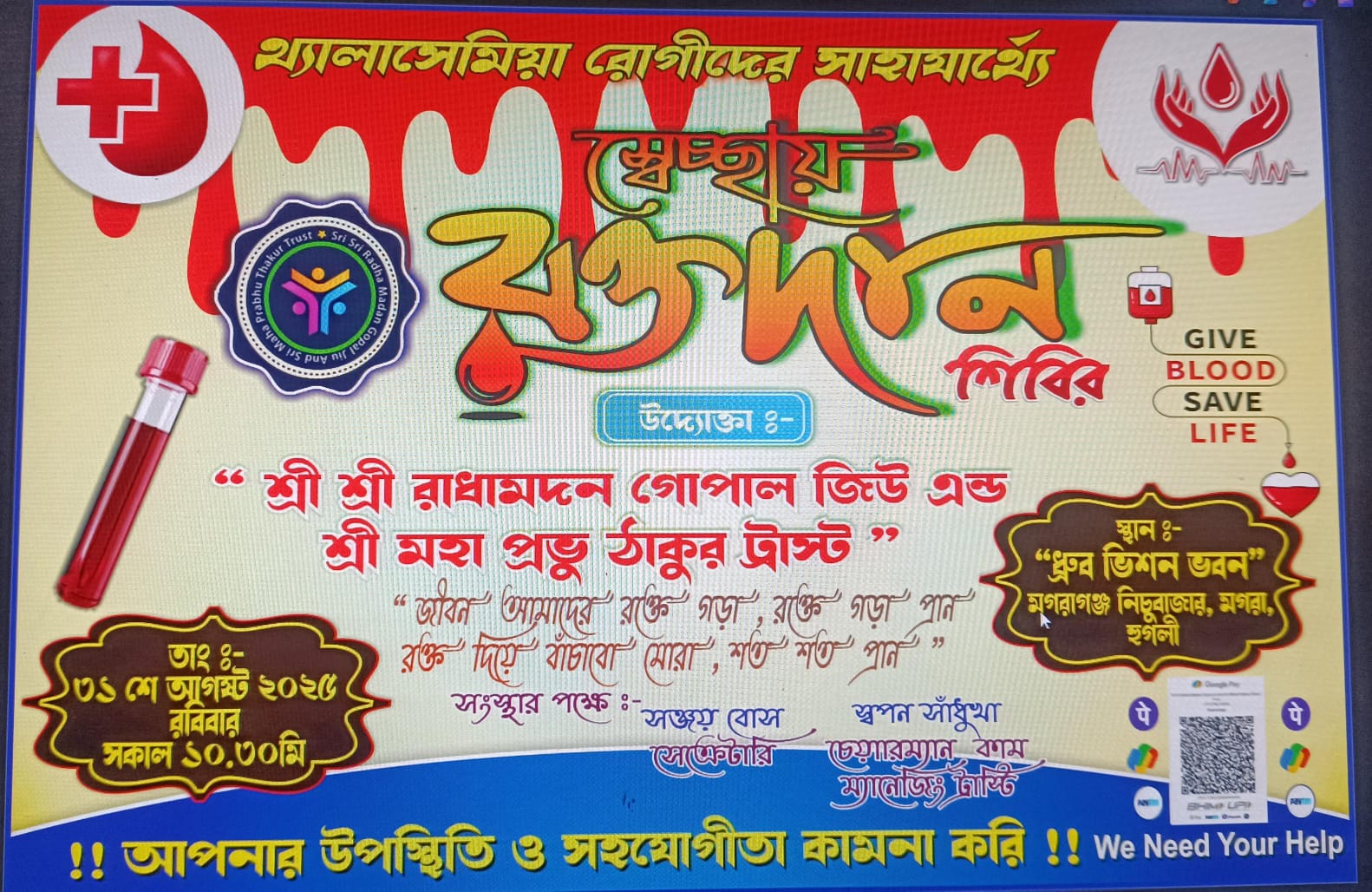 আমাদের সকলের প্রিয় স্বেচ্ছাসেবী সংস্থা ” শ্রী শ্রী রাধামদন গোপাল জিউ এন্ড শ্রী মহাপ্রভু ঠাকুর ট্রাস্ট” – এই সংস্থার ষষ্ঠ বৎসর পূর্তি উপলক্ষে আগামী ০৬/১২/২০২8 তারিখ শুক্রবার সমাজের দুঃস্থ, অসহায় ও পিছিয়ে পড়া মানুষদের শীতবস্ত্র বিতরনের উদ্যোগ নেওয়া হয়েছে।।